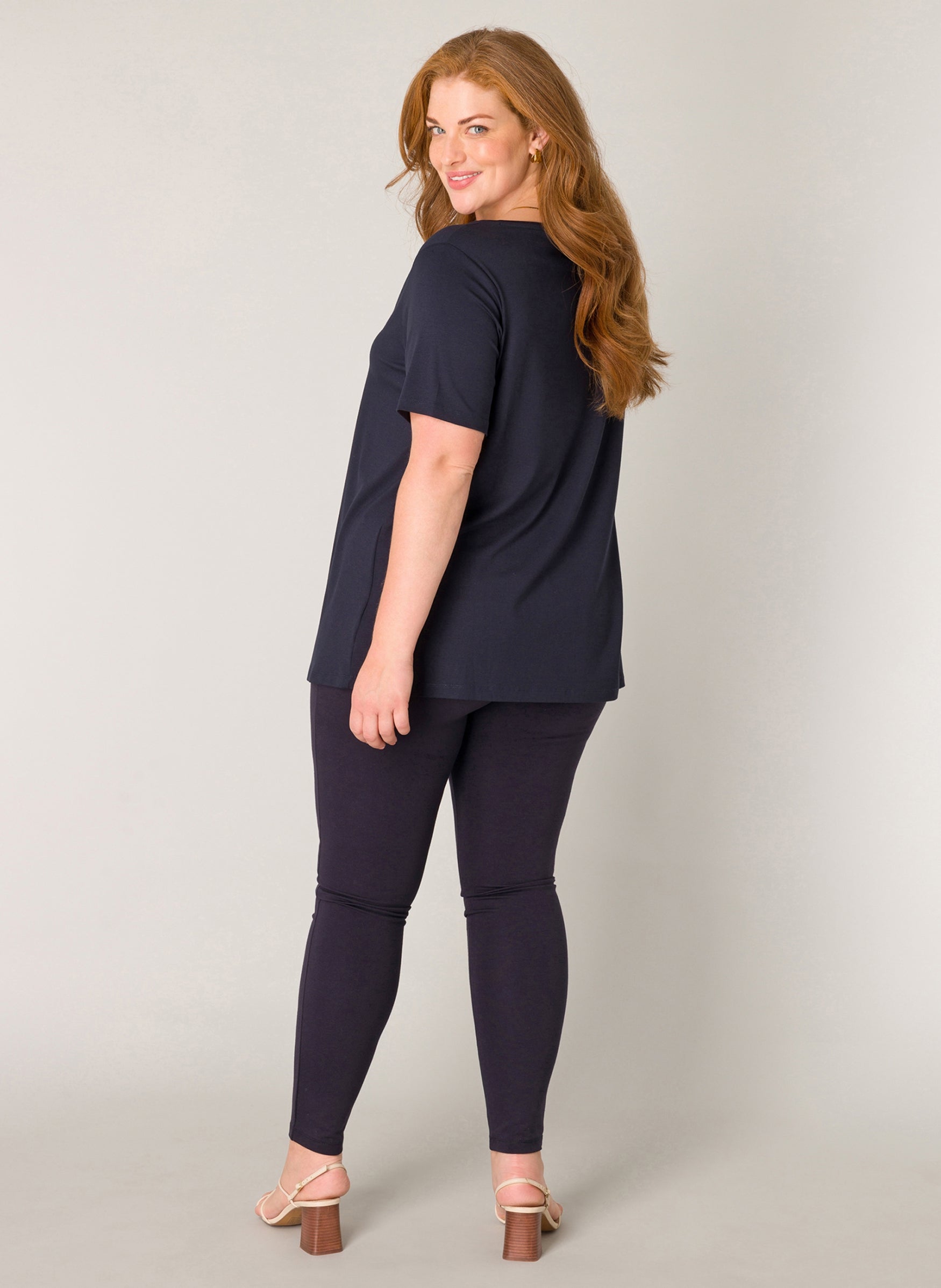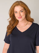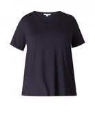 Dunkelblaues Basic-T-Shirt mit kaschierender A-Line und V-Ausschnitt.