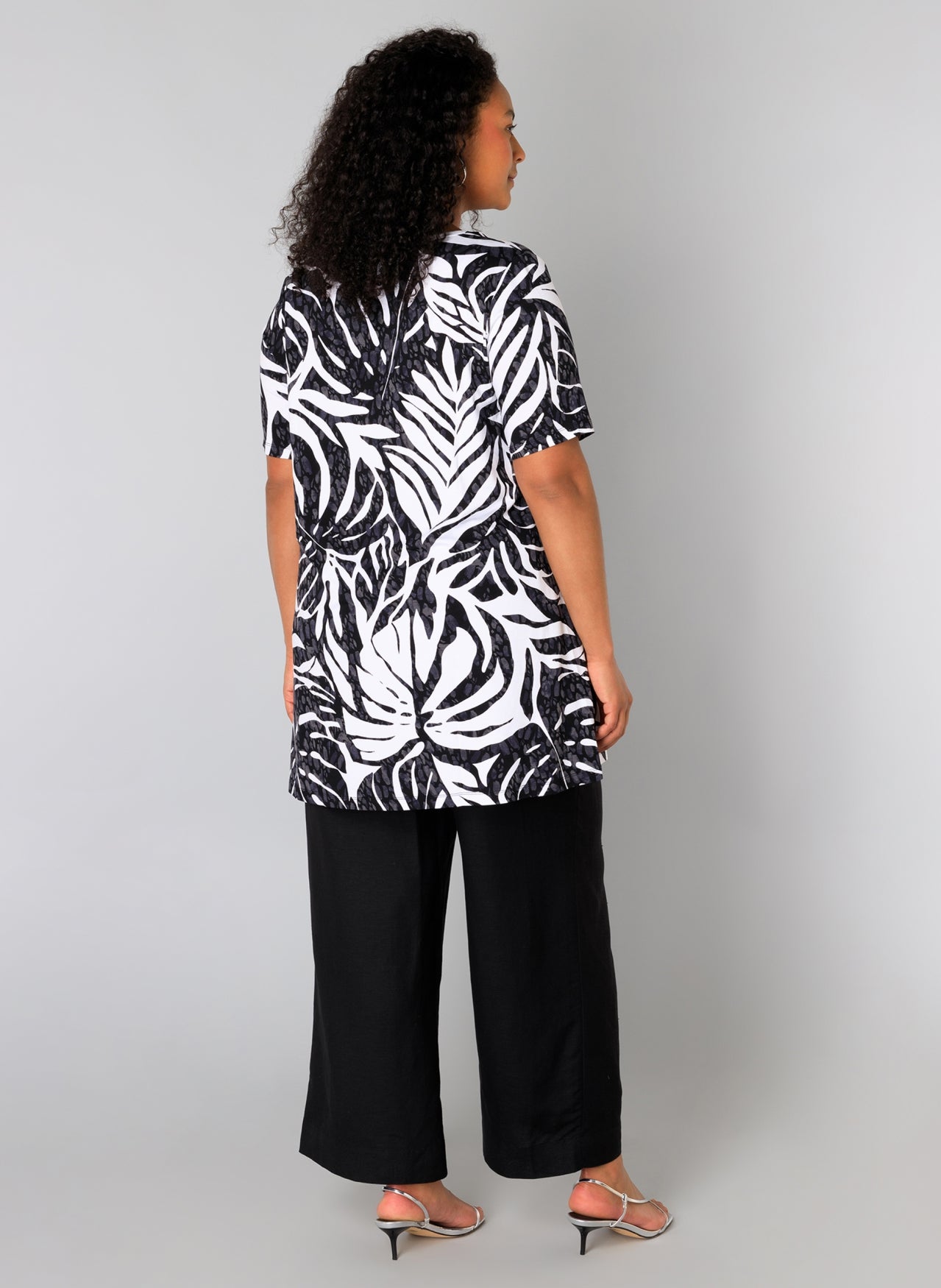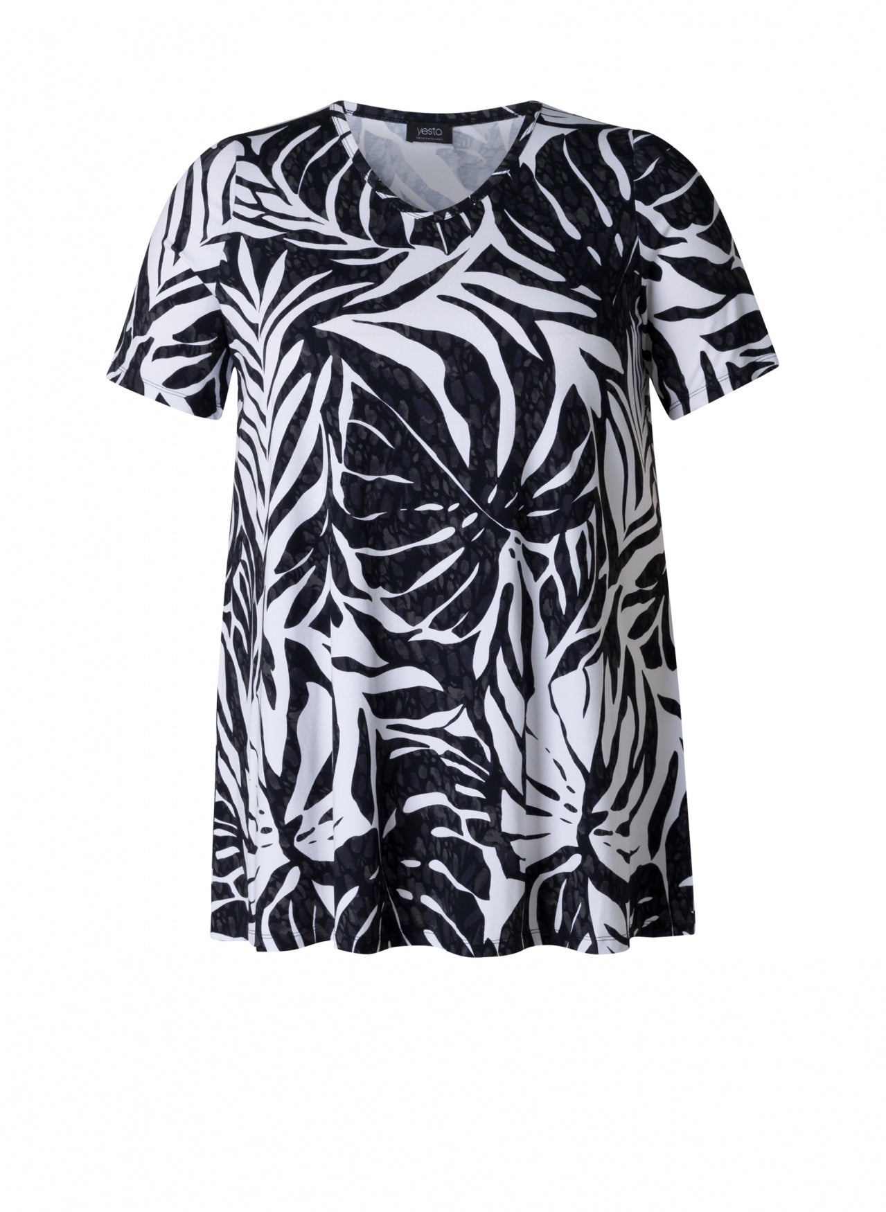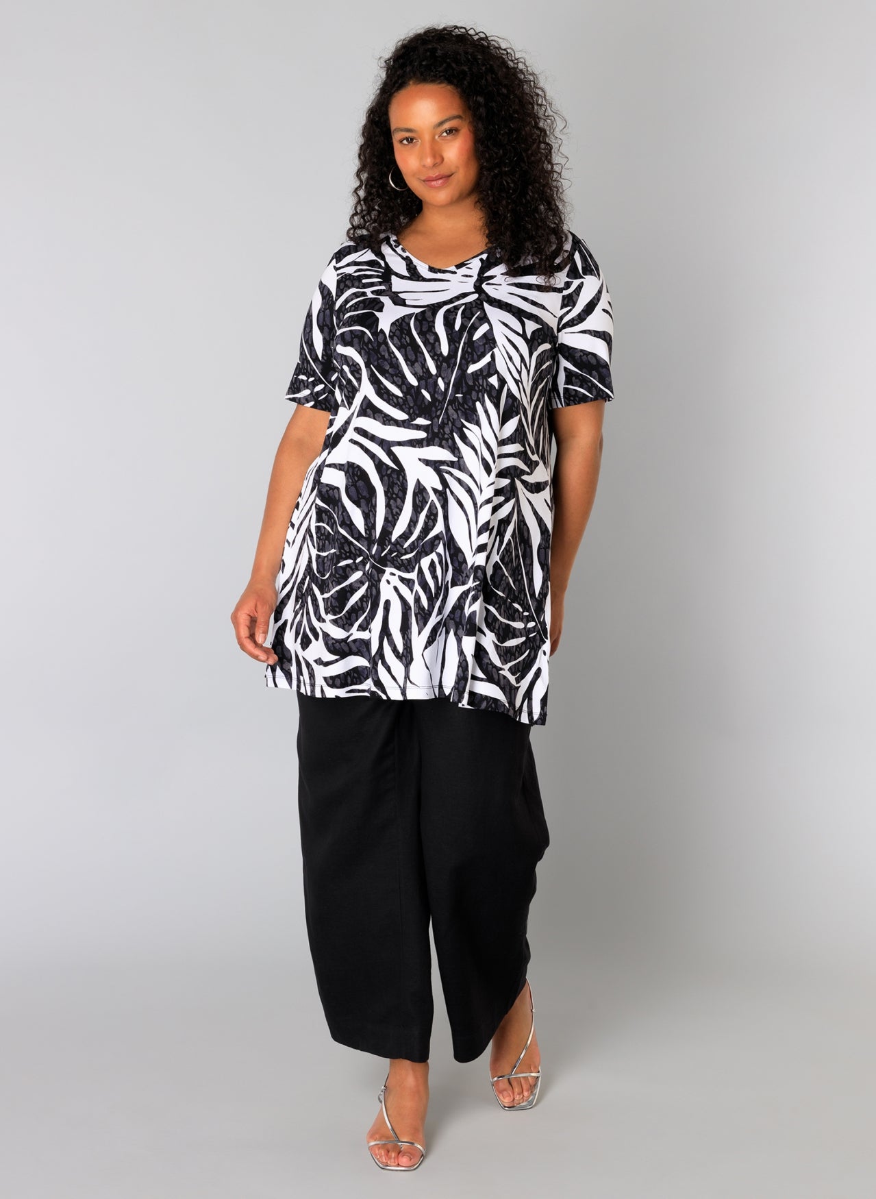 Schwarz weiß gemusterte Jerseytunika in A-Linie mit Halbarm und V-Ausschnitt.