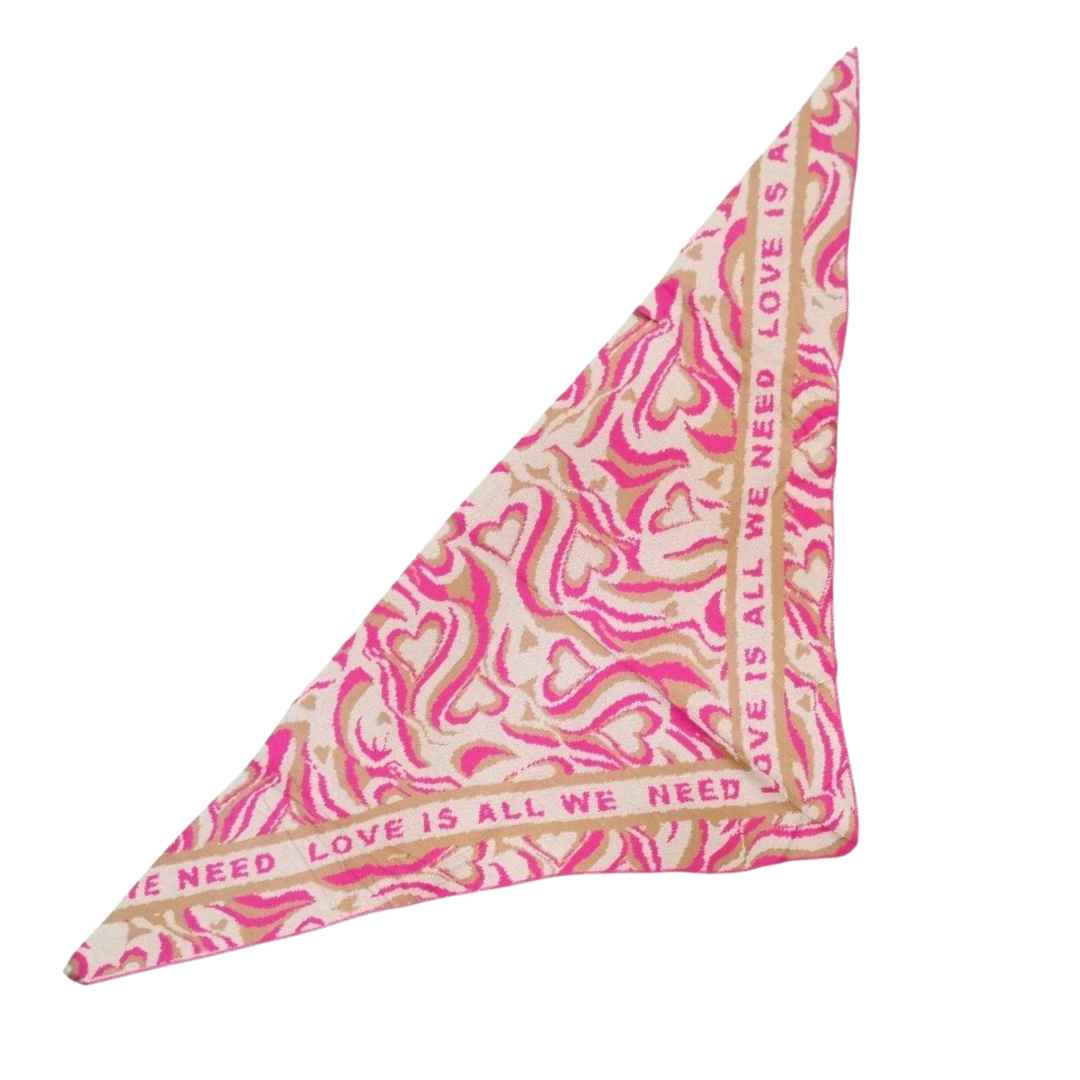 Dreiecks-Schal mit einem tollen Muster in Beige mit Pink und einem Schriftzug: Love is all we need. Viskose-Strick.