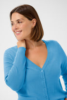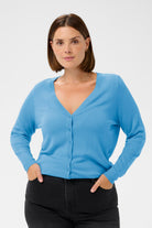 Der Cardigan KCmaula von Kaffe Curve ist dein leichtes Plus-Size-Basic für Frühling und Sommer. Der feine Strick in hellblau wirkt frisch und feminin, während V-Ausschnitt und Knopfleiste deine Proportionen sanft strecken. Die normale Passform sitzt bequem und lässt sich vielseitig kombinieren – ganz ohne aufzutragen.