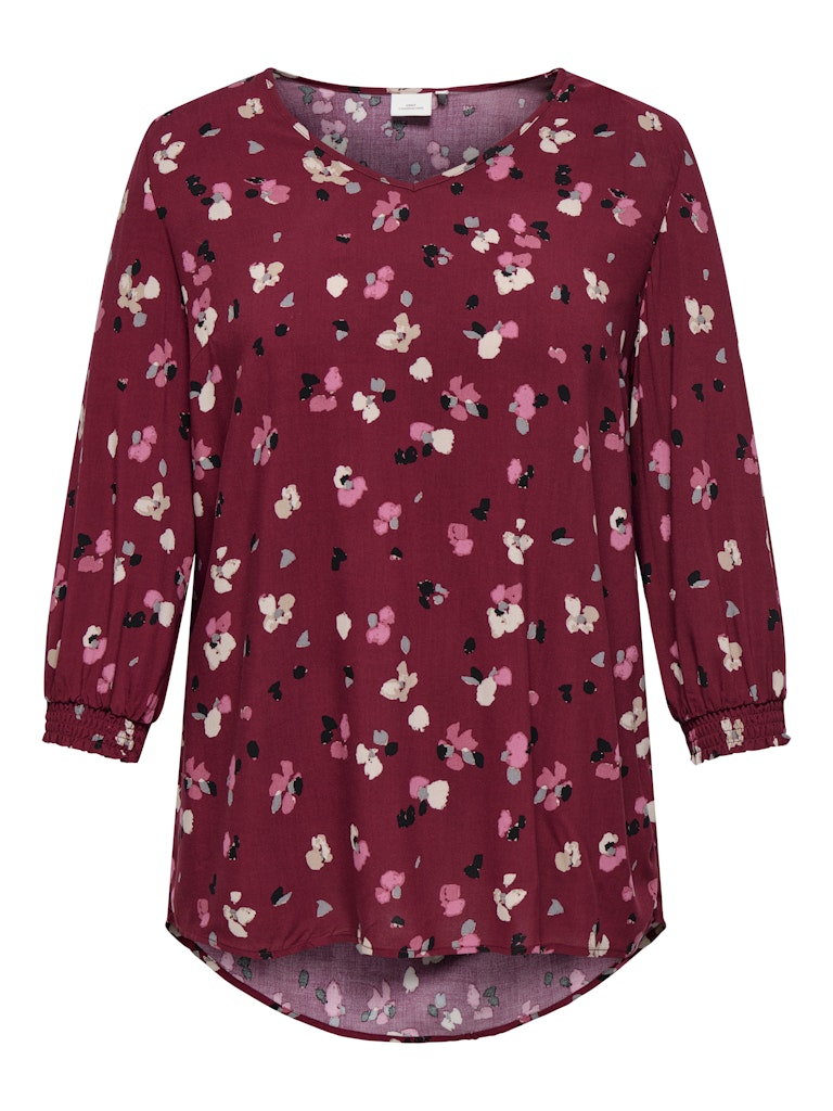 Die Tunika Carpetrea von ONLY Carmakoma zeigt, wie stilvoll Plus Size Mode im Alltag sein kann. Ihr gedeckter Rotton mit Blütenprint in Pink, Grau und Weiß verleiht dem Look eine feminine Leichtigkeit. Die reine Viskose fällt wunderbar weich, während der V-Ausschnitt und die gesmokten 3/4-Ärmel charmante Details setzen. Durch den hinten leicht verlängerten Schnitt umspielt sie sanft die Hüfte – perfekt für einen lässig-femininen Auftritt.