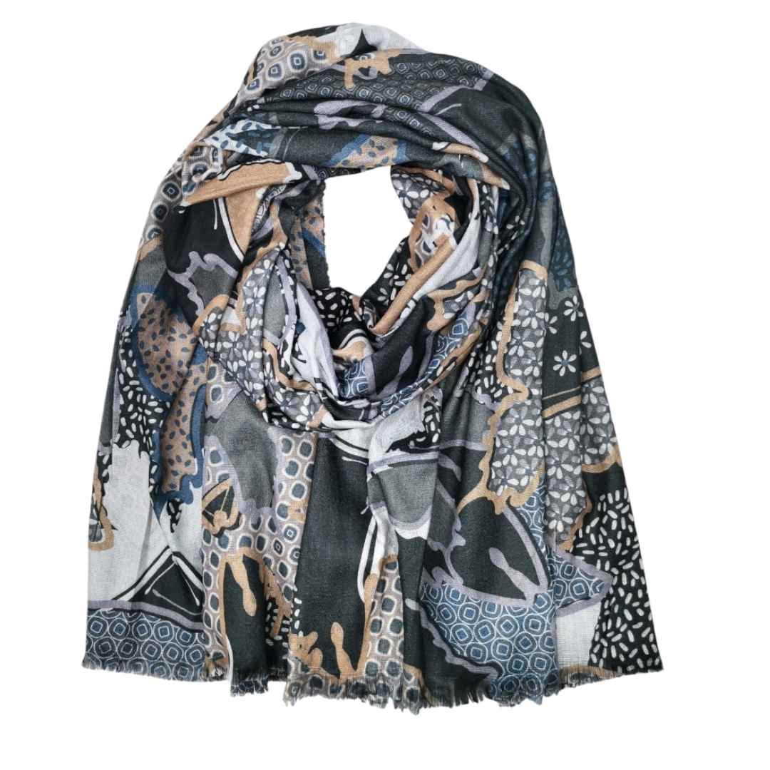 Winterschal aus Viskose mit einem modernen Muster in Blau-Schwarz.