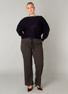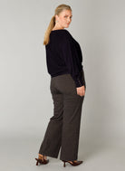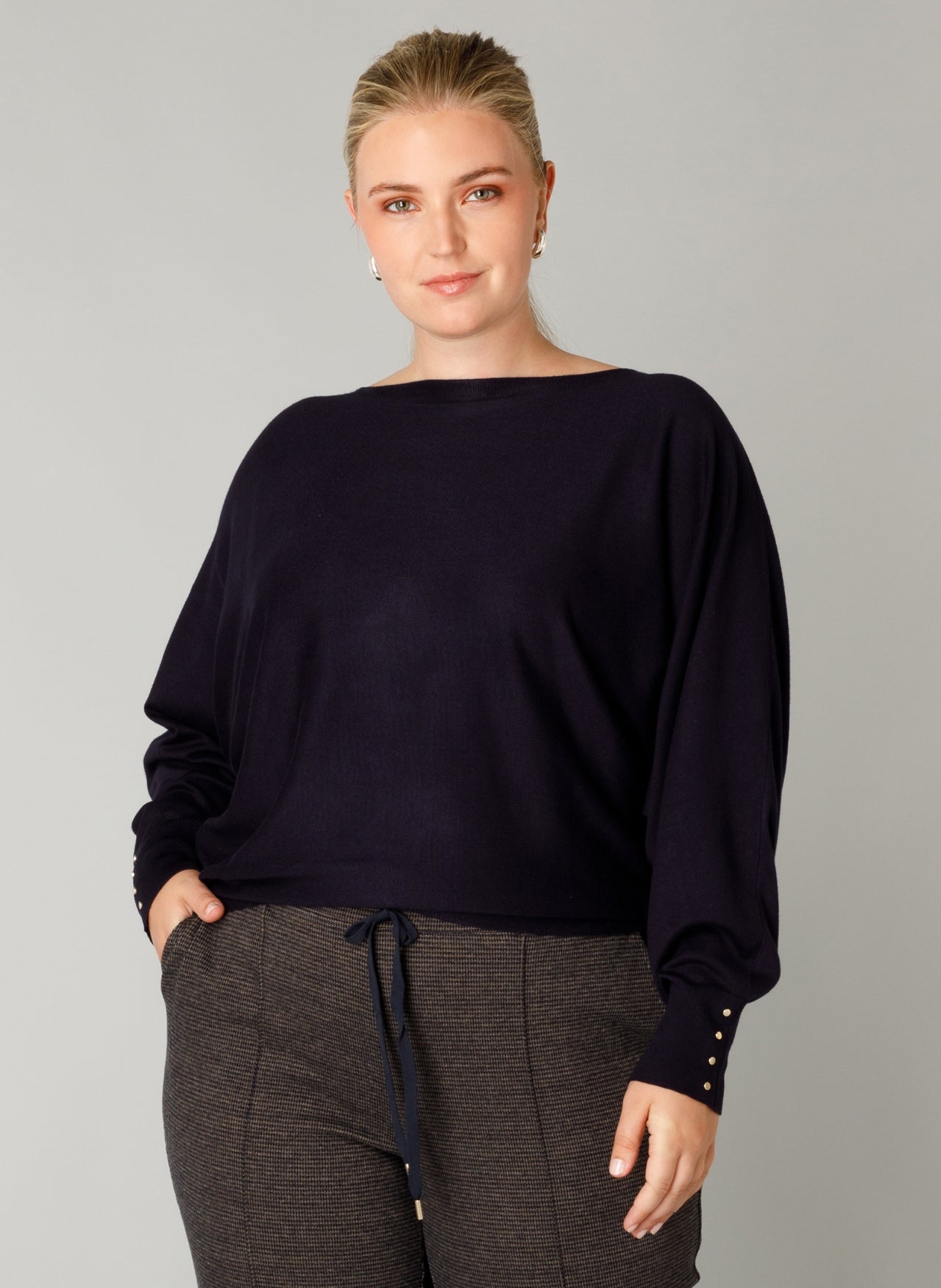 Feinstrickpullover mit U-Boot-Ausschnitt und kürzerer Länge. Elegante weite Ärmel mit breiterem Bündchen. Diese haben kleine goldene Zierknöpfe.