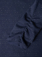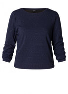 Sweatshirt/Pullover mit Rundhals und einem dreiviertel-langen Ärmel. Die Ärmel sind gerafft. Das Sweatshirt ist blau mit kleinen, goldenen Sprenkeln.