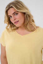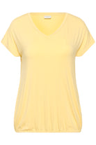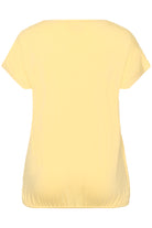 Schönes, sommerliches T-Shirt in Gelb. Mit V-Ausschnitt und einem Gummizug unten am Saum.