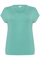 Passt perfekt in den Sommer: Das Basic T-Shirt in Türkis mit V-Ausschnitt und einem Gummizug unten am Saum.