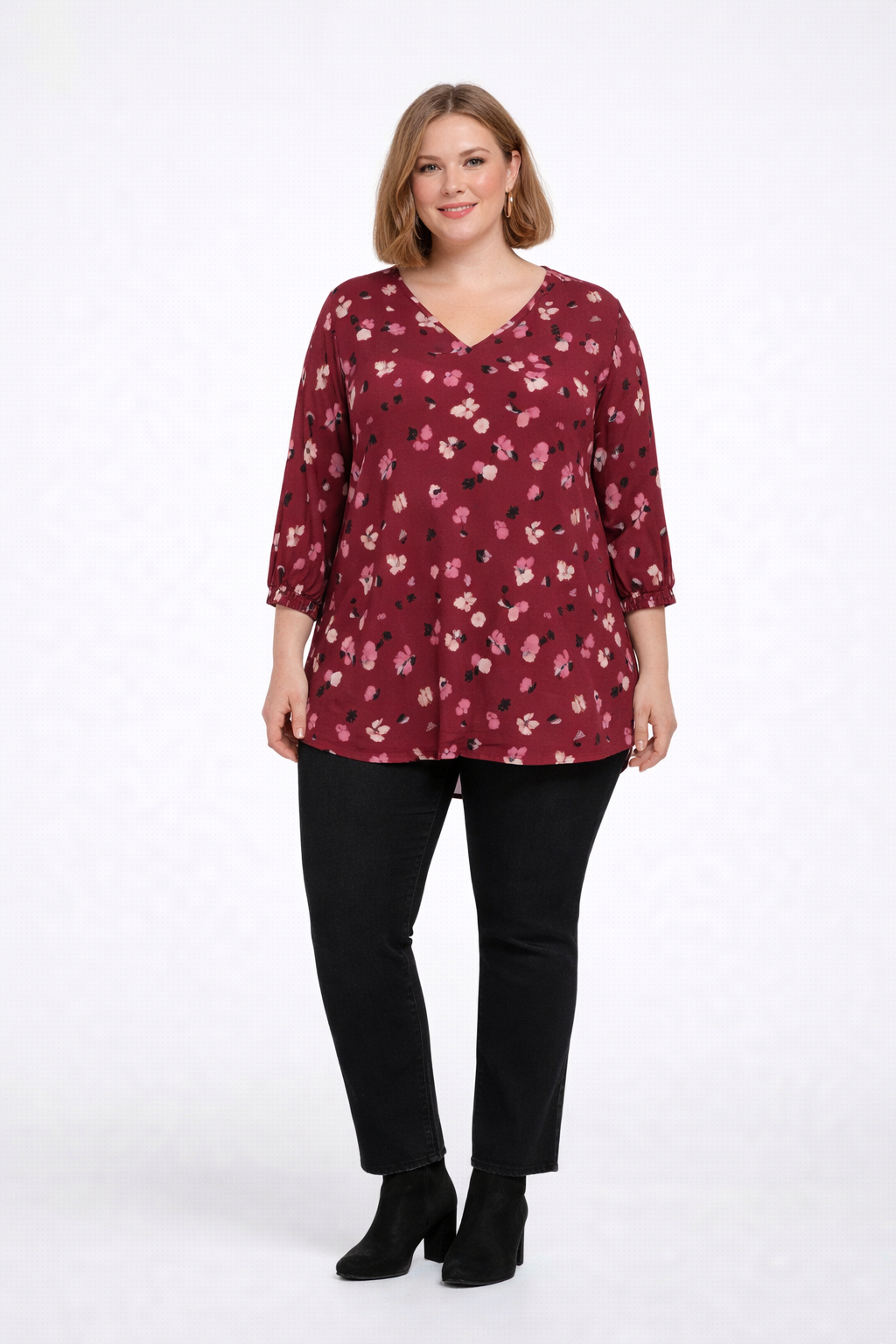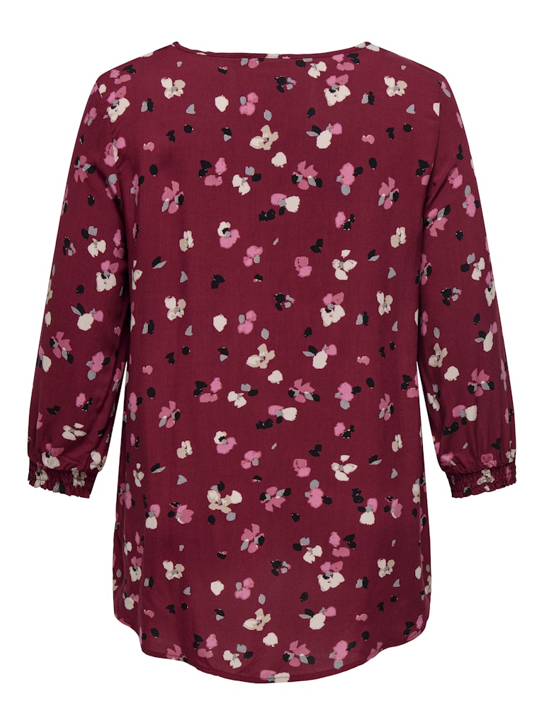 Die Tunika Carpetrea von ONLY Carmakoma zeigt, wie stilvoll Plus Size Mode im Alltag sein kann. Ihr gedeckter Rotton mit Blütenprint in Pink, Grau und Weiß verleiht dem Look eine feminine Leichtigkeit. Die reine Viskose fällt wunderbar weich, während der V-Ausschnitt und die gesmokten 3/4-Ärmel charmante Details setzen. Durch den hinten leicht verlängerten Schnitt umspielt sie sanft die Hüfte – perfekt für einen lässig-femininen Auftritt.