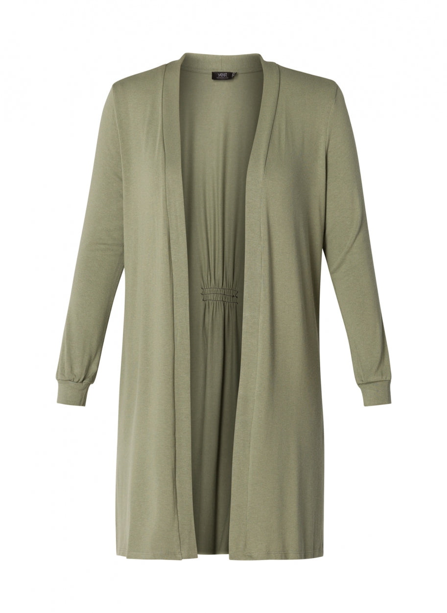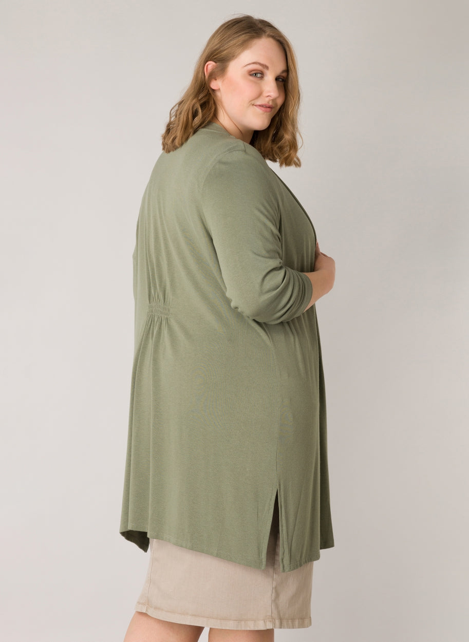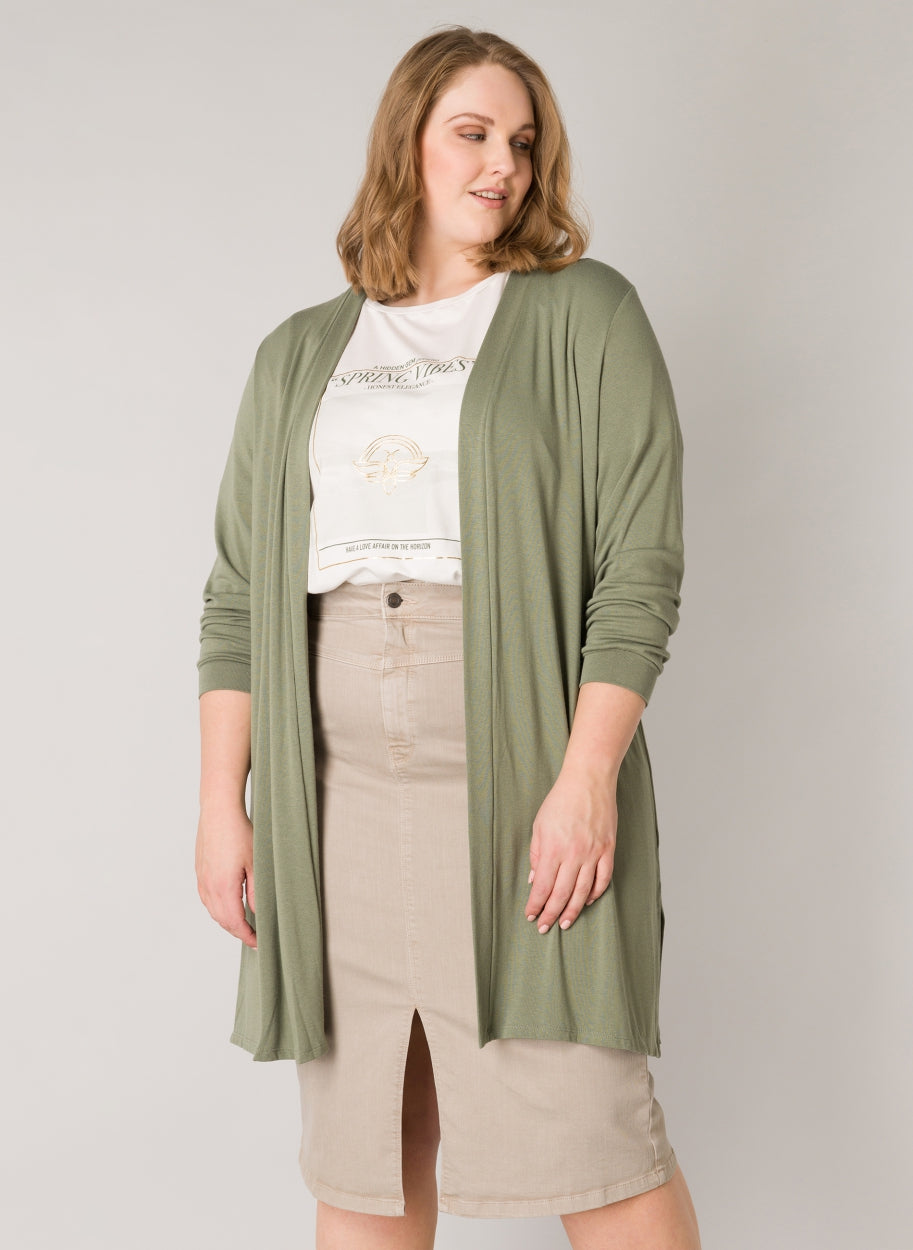 Der Jerseycardigan überzeugt mit schöner Länge und einer kleinen Taillierung hinten im Rücken. Perfekt auf Tuniken, Kleider oder auch Outfits mit Rock, Hose oder Jeans.