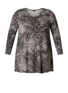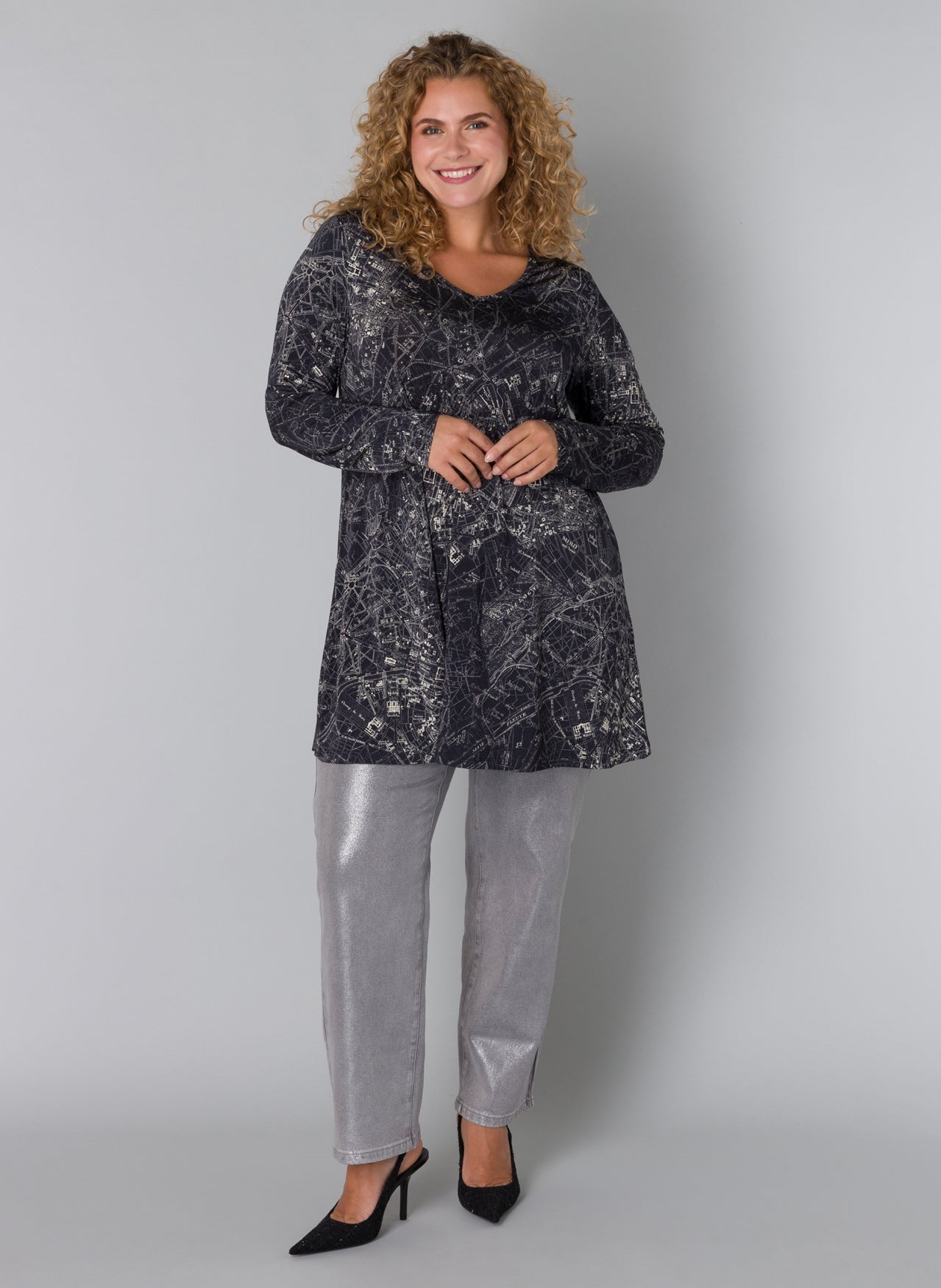 Hochwertige Viskose-Tunika mit einem dezenten Allover-Druck in Schwarz/Grau. Mit V-Ausschnitt und einem langen Ärmel.