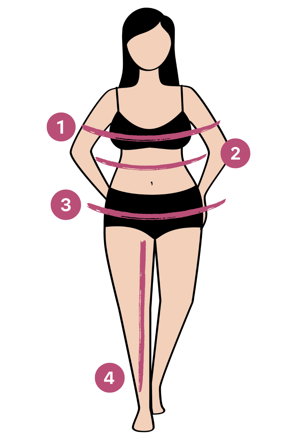 Am besten misst du dich direkt auf der Unterwäsche, um genaue Ergebnisse zu erhalten. Schreibe die Maße auf und vergleiche sie mit unserer Größentabelle – so findest du deine ideale Konfektionsgröße.