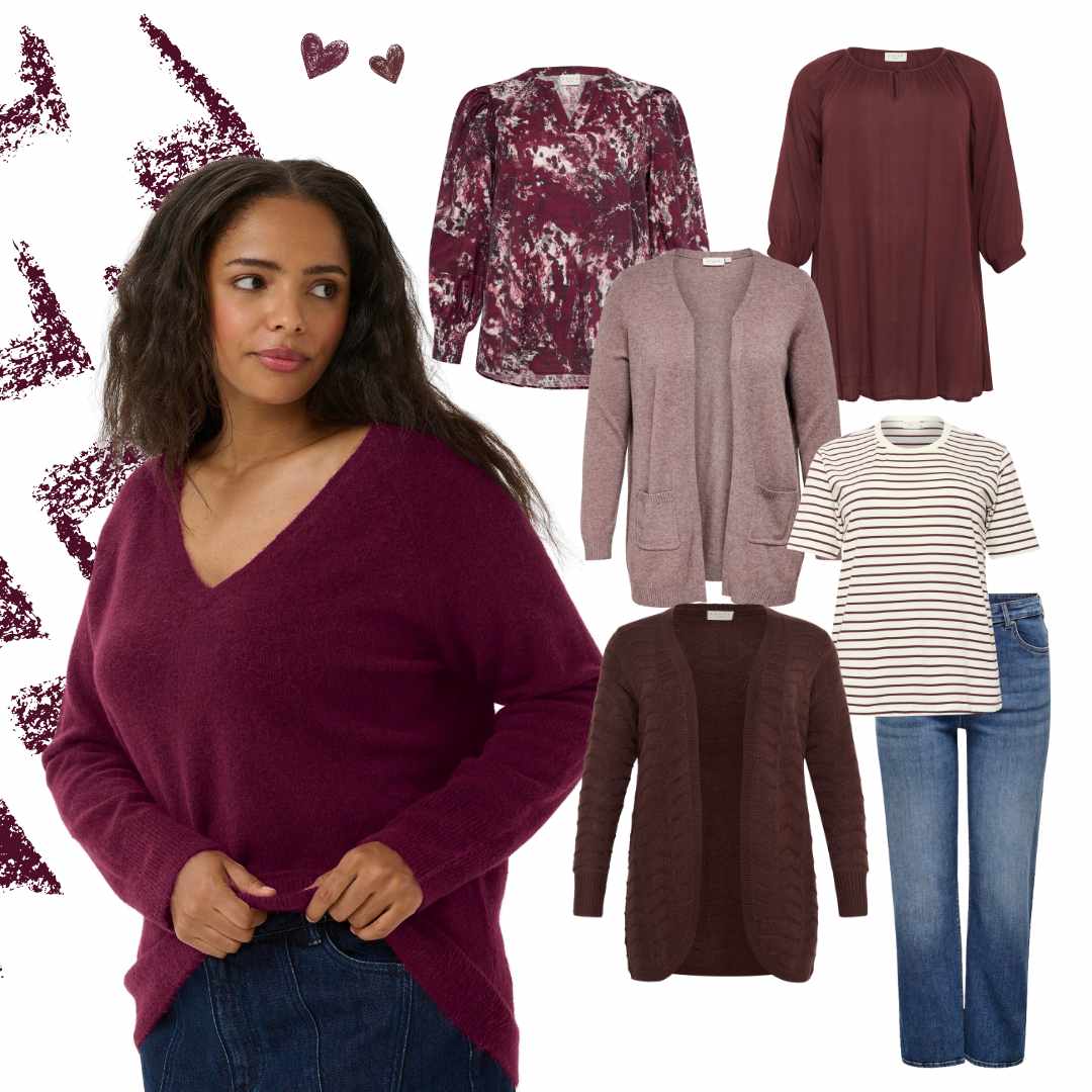 Bordeaux – dieses tiefrote Weinrot bringt Wärme, Eleganz und einen Hauch Romantik in deinen Kleiderschrank! Plus Size Marken wie ONLY Carmakoma oder Kaffe Curve zeigen, wie vielseitig der Ton sein kann: gemütliche Pullover, feminine Blusen, lässige Tuniken oder stylische Jacken in großen Größen machen jeden Look zum Hingucker.