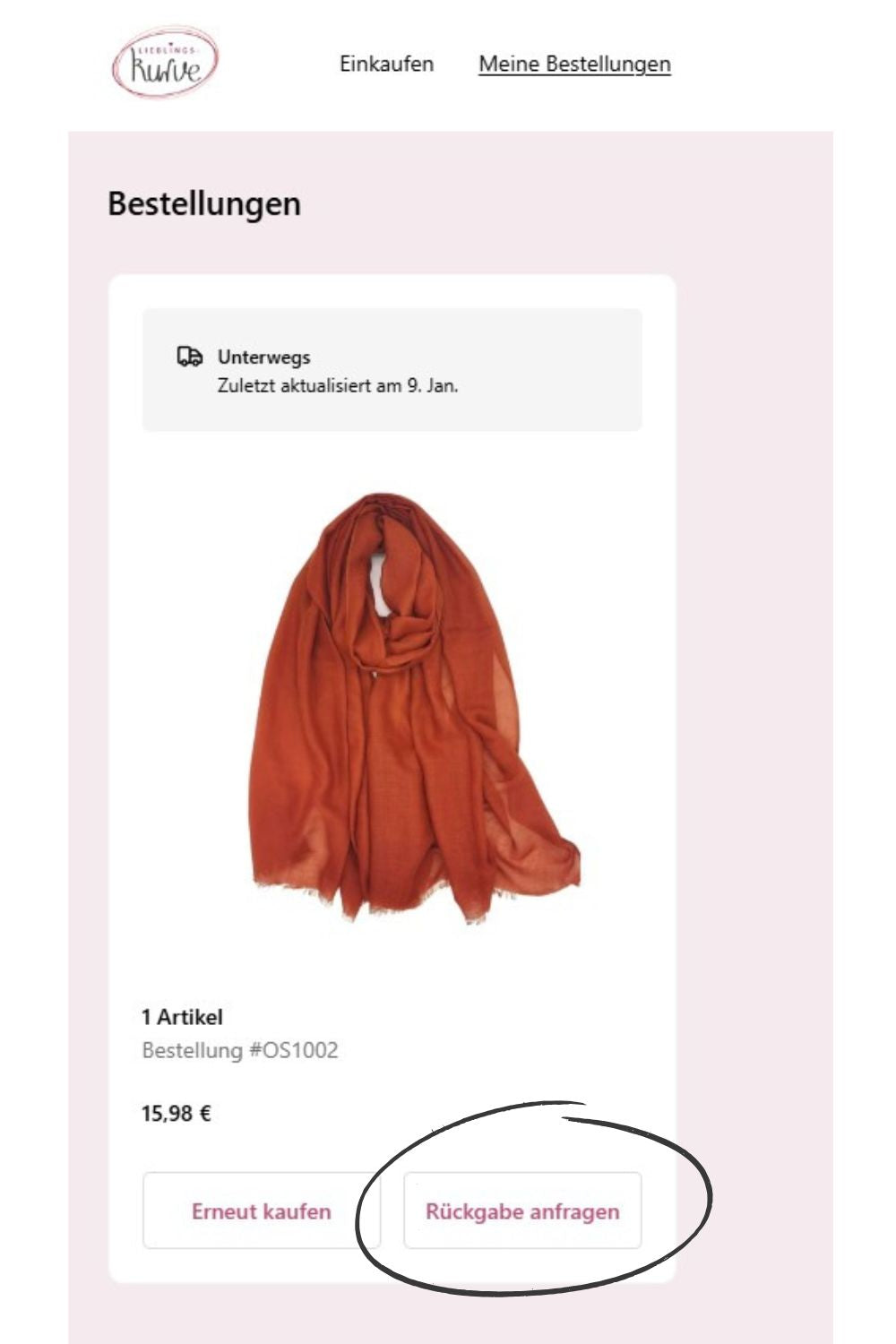 Wenn du eingeloggt bist, kannst du die Bestellung in deinem Kundenkonto aufrufen und findest dort einen Button "Rückgabe anfragen" (siehe Foto). Dann folge den Anweisungen. Du kannst hier die Artikel, die du retournieren möchtest und auch den Grund auswählen.