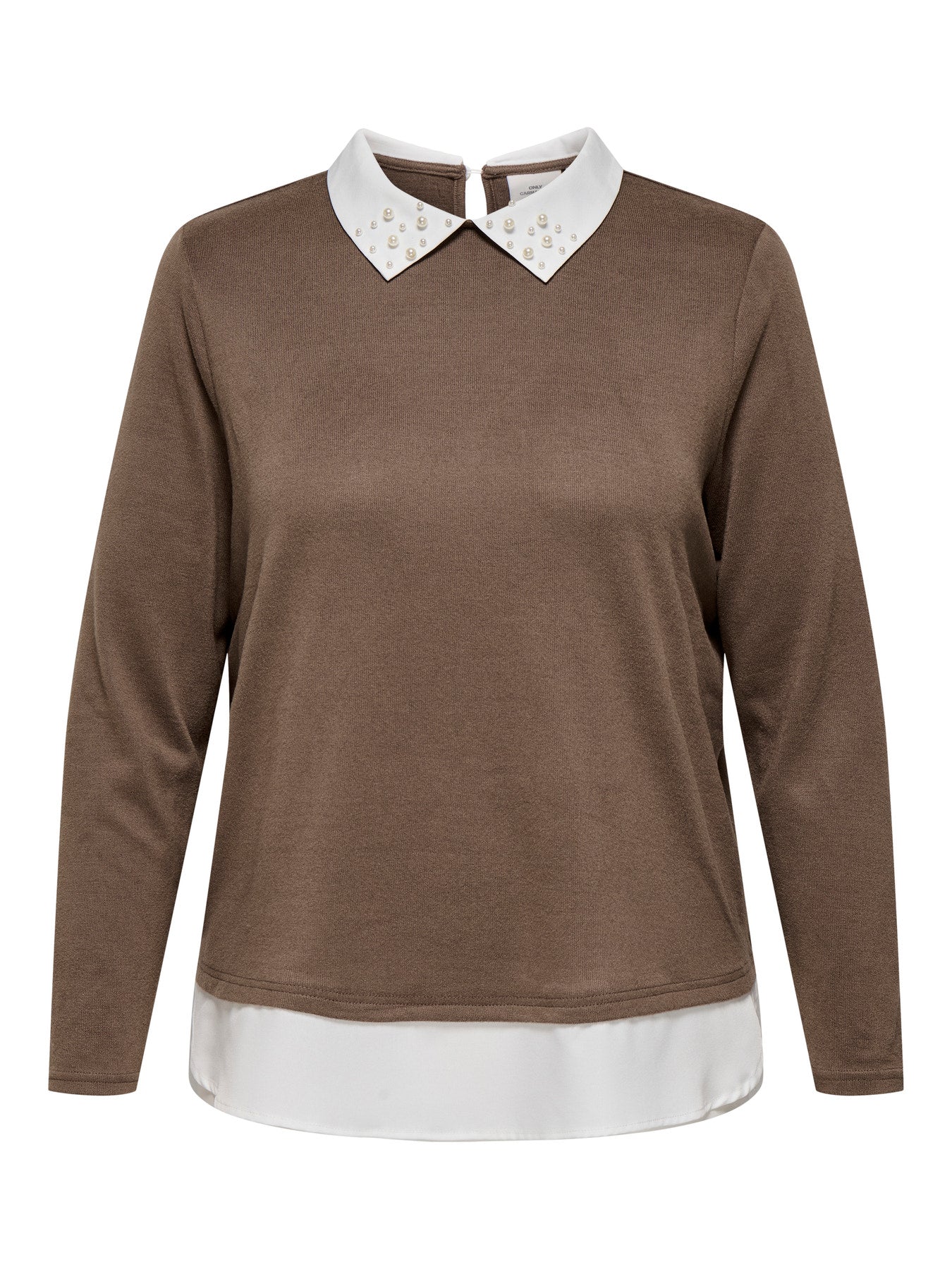 Dieses 2-in-1 Shirt Caralba von ONLY Carmakoma vereint den Komfort eines Shirts mit der eleganten Optik einer Bluse. Der Blusenkragen mit zarten Perlen und die weiß abgesetzten Blusenteile setzen edle Akzente zum hellbraunen Regular Fit-Shirt – perfekt für Alltag, Büro oder festliche Anlässe.