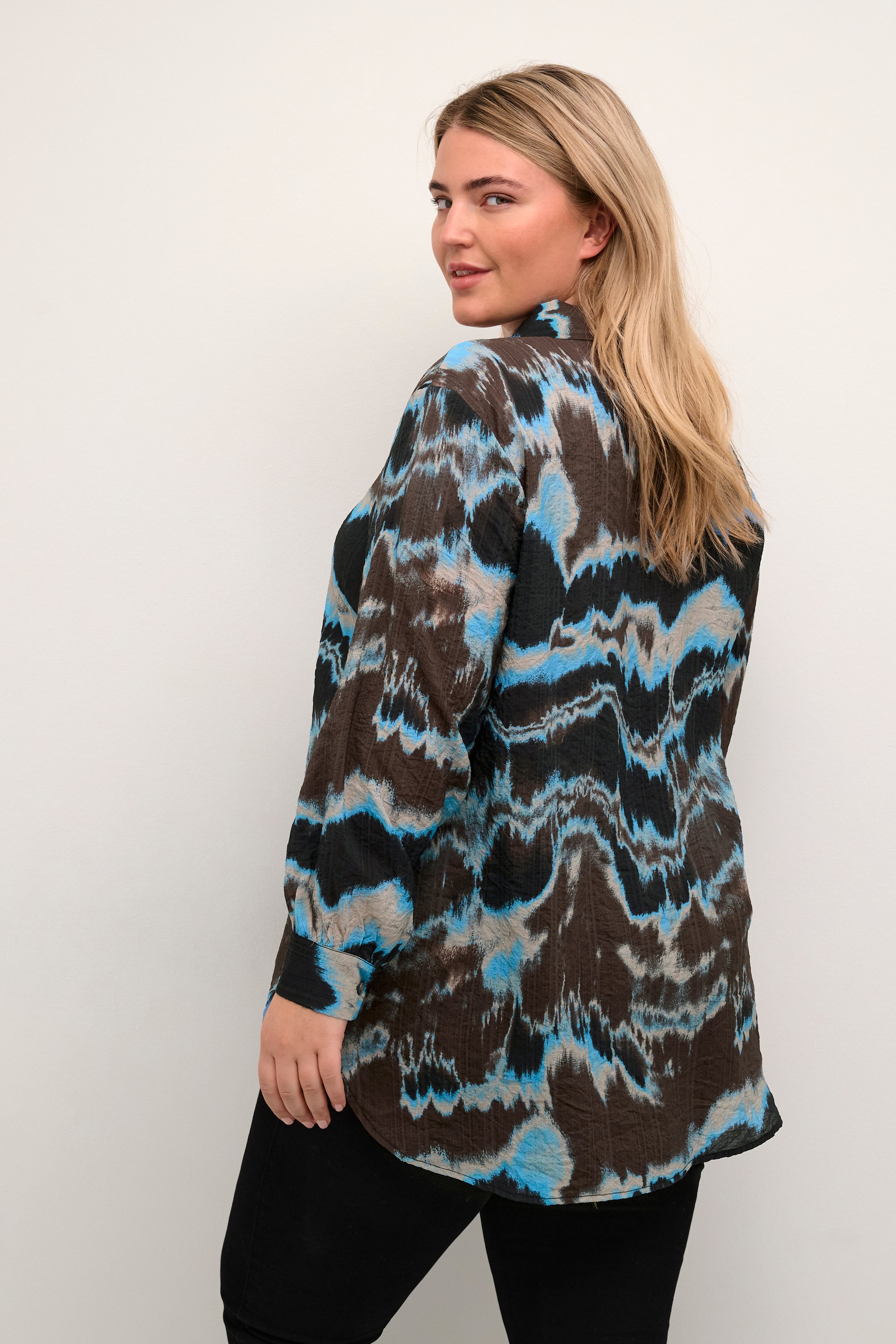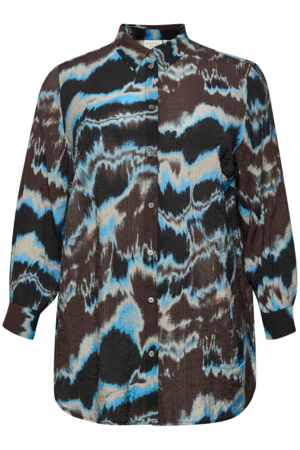 Das auffällige Batikmuster in den Farben braun, creme, hellblau und schwarz macht diese schöne Hemdbluse zum Hingucker.