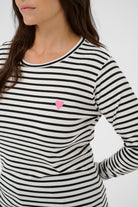 Jetzt entdecken und deine Kurven selbstbewusst in Szene setzen: Das Langarmshirt KClia von Kaffe Curve kombiniert ein zeitloses Schwarz-Weiß-Streifenmuster mit figurnahem Slim Fit – perfekt für Plus Size Frauen, die klare Linien lieben. Die kleine Herz-Stickerei setzt einen liebevollen Akzent und bringt ein bisschen Lieblingskurve-Feeling in deinen Alltag.