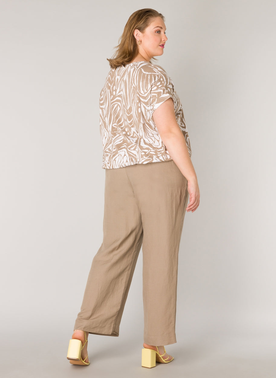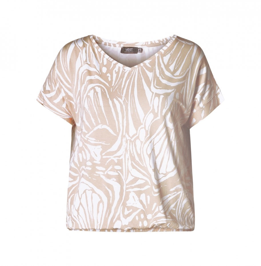 Schönes Shirt mit V-Ausschnitt und kurzen Ärmeln. Das sommerliche Muster in weiß mit hellem Cappuccino-Braun überzeugt auf ganzer Linie. Du kannst das Shirt zum Beispiel zu weißen Hosen oder auch zu Jeans tragen.